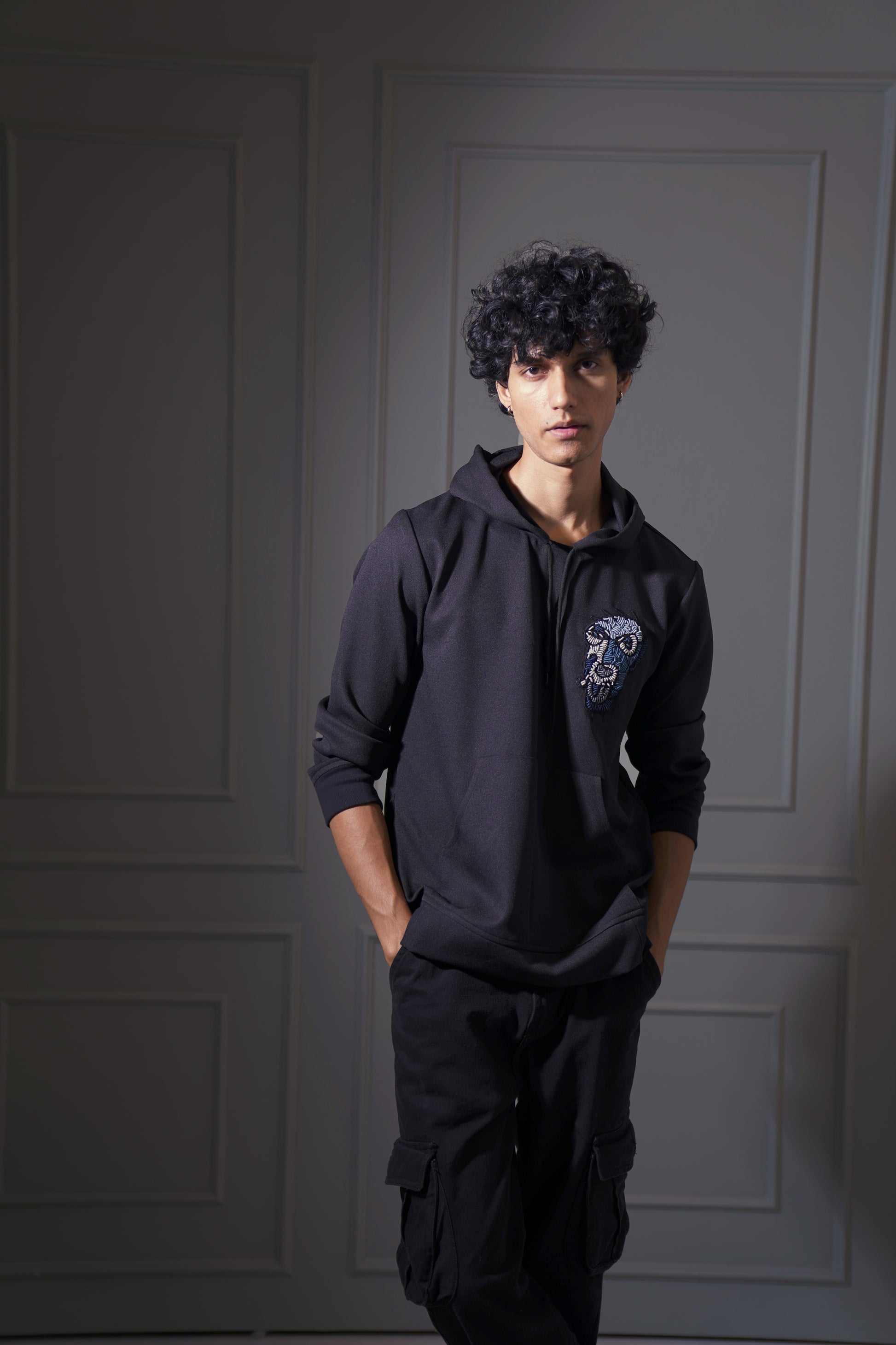 Uplift your winter wardrobe with everyone’s favourite hoodie, featuring a striking embroidered design inspired by Bhuwal Prasad's iconic artwork from our Urban Graphic collection. Rendered in midnight tones of blues, black, white, and navy, this bold yet subtle piece is perfect for those who appreciate classic style with an edge.